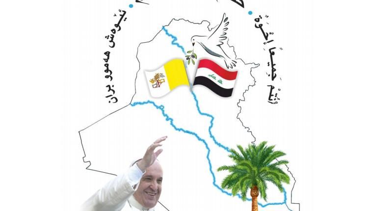 Sigillo ufficiale della visita di Papa Francesco in Iraq, una palma, le bandiere dell’Iraq e del Vaticano sormontate da una colomba e sullo sfondo il Tigri e l’Eufrate. E una scritta in arabo “Siete tutti fratelli” a incorniciare l’immagine.